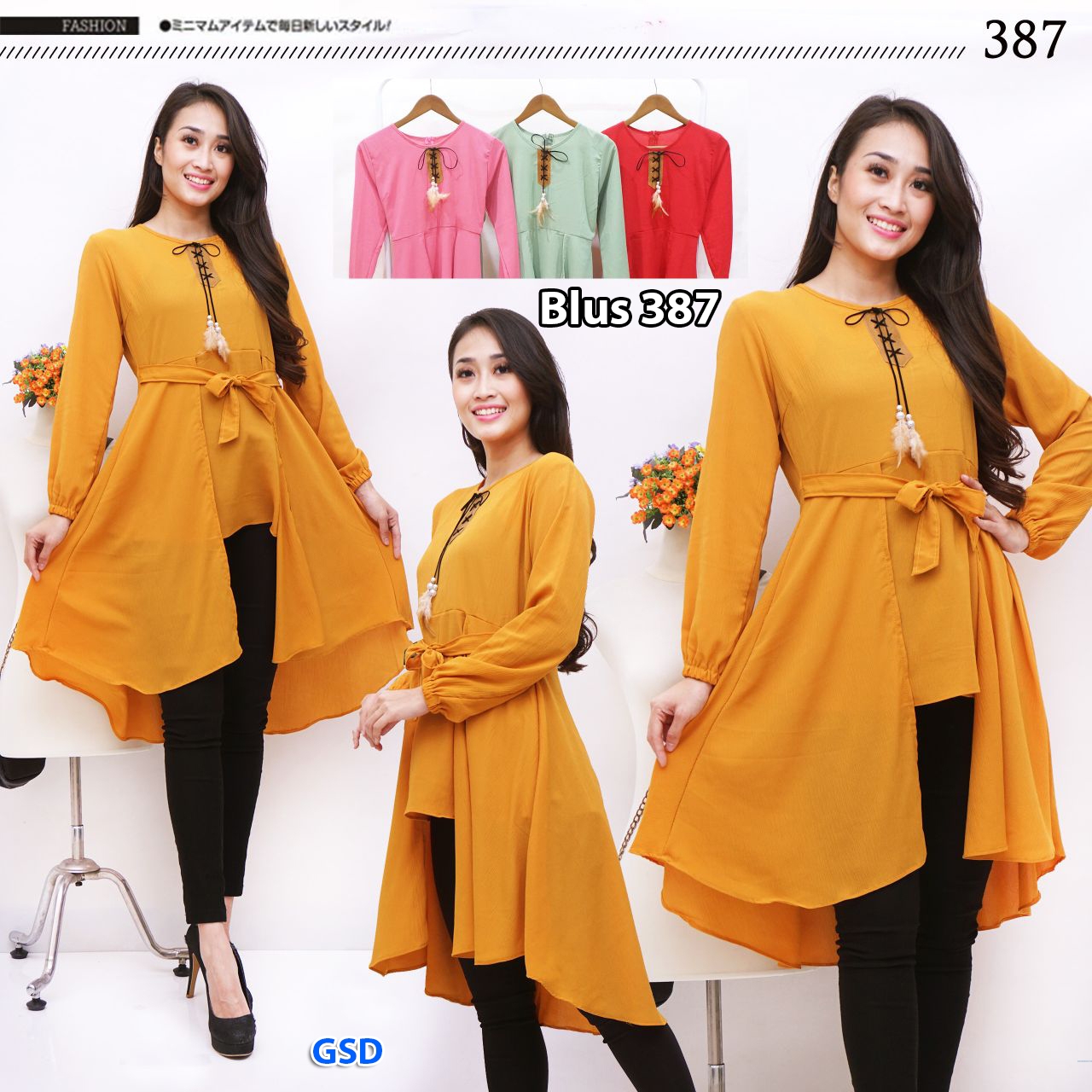 Blus 387@82rb seri 4warna ecer 87rb fit M bahan crepe blus lengan panjang belakang ziper pinggang tali ikat Ld84cm panjang depan 60cm belakang 100cm (320gr)