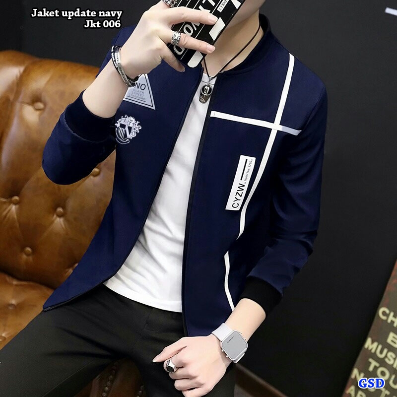 Jaket update navy@72b min 3pcs ecer 77Rb fit M bahan weges sablon lengan panjang ziper depan Ld100cm Pjg60cm (350gr)