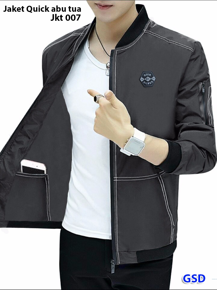 Jaket Quick abu tua@68rb min 3pcs ecer 73rb fit M bahan weges lengan panjang seleting depan saku kiri kanan Ld90cm Pjg65cm (420gr)