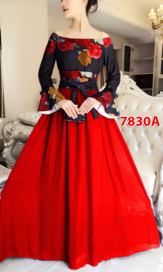 Longdress import 7830A red@190rb min 3pcs ecer 195rb terusan dress sabrina lengan panjang terompet scuba bunga,bawah sifon furing+belt bahan lepas Ld80cm Pjg135cm (550gr)