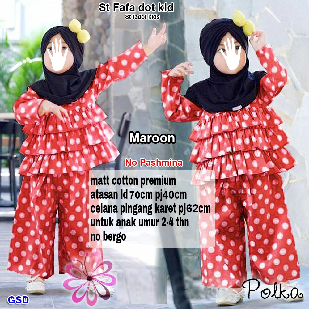 ST fafa dot kids maroon@85rb min 3pcs ecer 90rb fit anak 5thn (no size) bahan katun blus lengan panjang Ld70cm Pjg40cm+celana pinggang belakang karet Pjg62cm (220gr) No Pashmina
