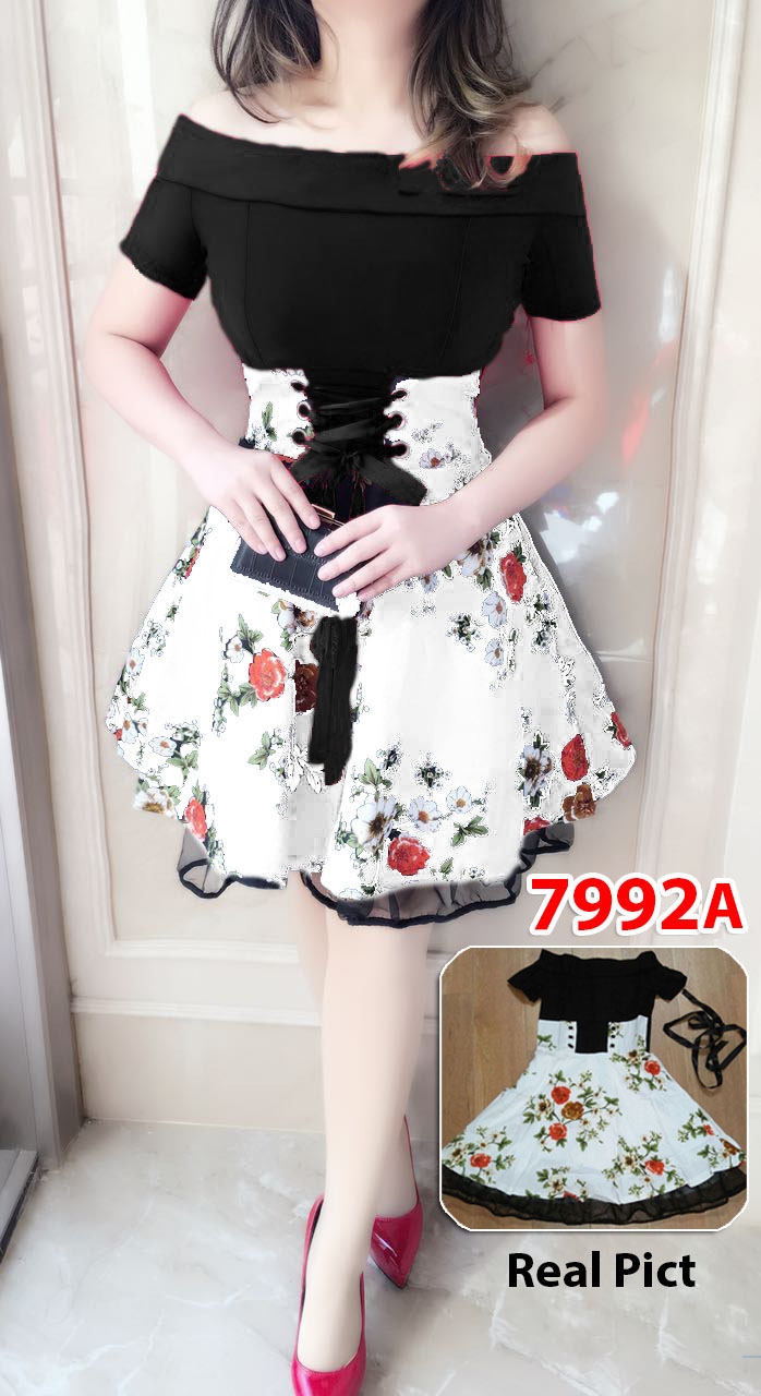 Dress import 7992A white@150rb min 3pcs ecer 155rb mini dress atas katun streth polos bawah katun bunga pinggang belt tempel Ld80cm Pjg80cm (300gr)