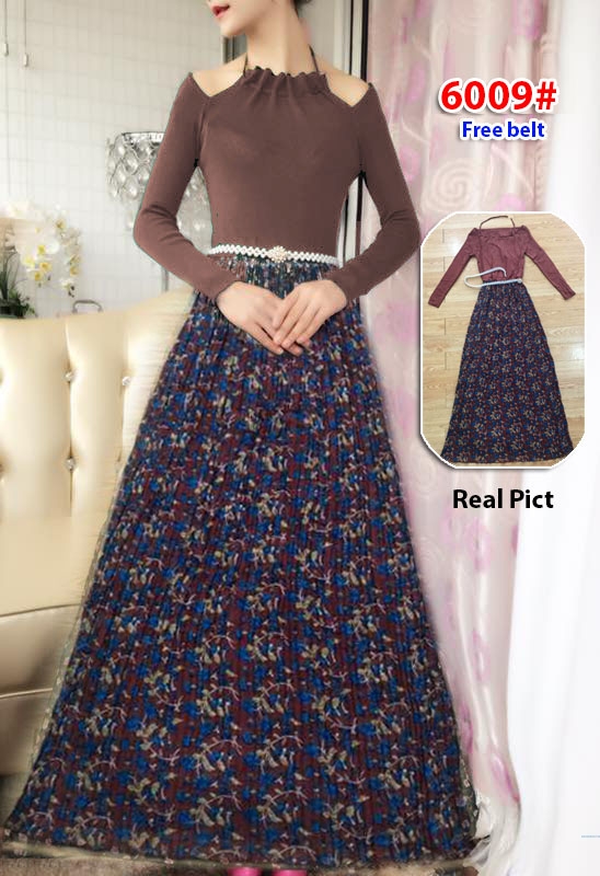 Maxi import 6009 coklat@155rb min 3pcs ecer 160rb maxi lengan panjang atas rajut bawah sifon bunga furing Ld80cm Pjg130cm+belt mutiara (700gr)