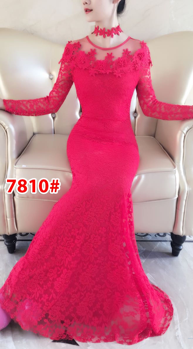 Longdress import 7810 red@165rb min 3pcs ecer 170rb maxi brukat streth furing lengan panjang leher tile +renda kalung leher Ld80cm Pjg130cm Fit M (600gr)