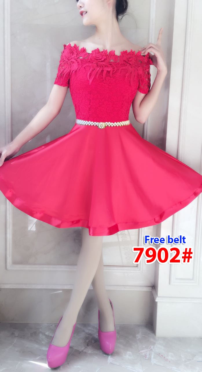 Mini dress import 7902 red@150rb min 3pcs ecer 155rb mini dress brukat furing Ld80cm Pjg80cm +belt mutiara Fit M (400gr)