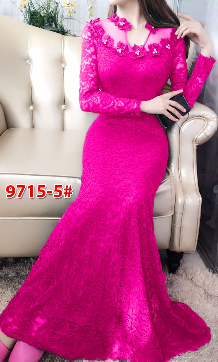Longdress import 9715 fanta@150rb min 3pcs ecer 155rb maxi brukat streth furing lengan panjang Ld80cm Pjg135cm fit M (600gr)
