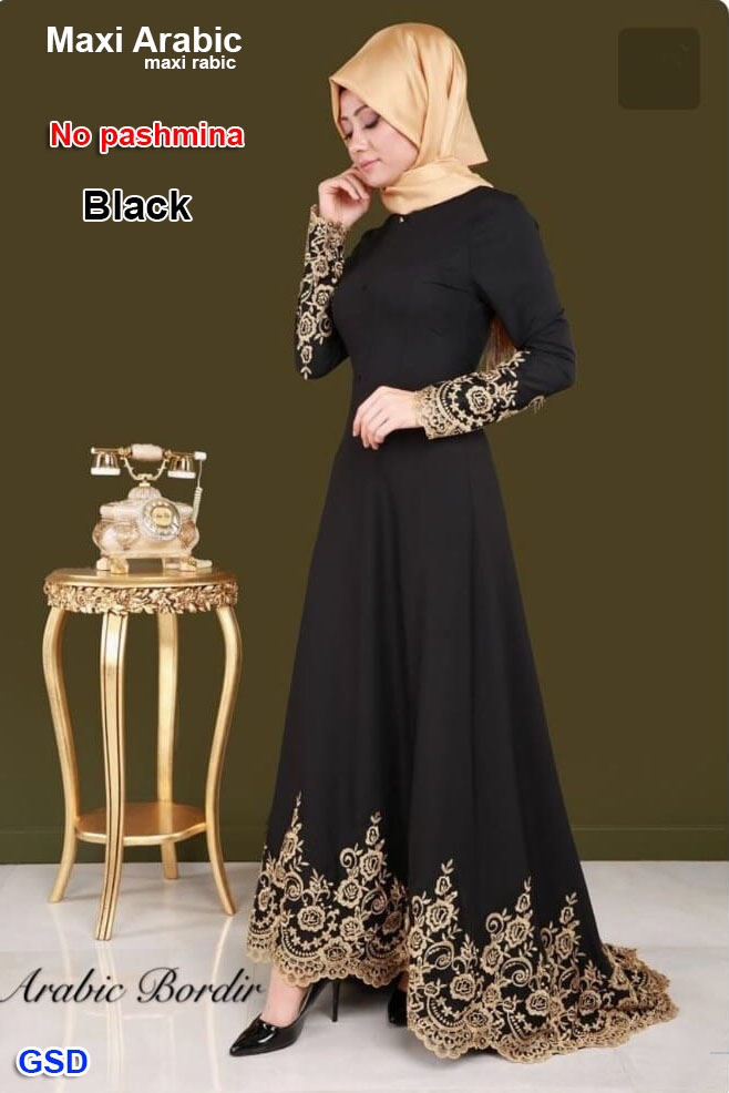 Maxi arabic black@112rb min 3pcs ecer 117rb bahan twiscone bordir batik maxi lengan panjang depan sleting ,pinggang belakang karet Ld90cm Pjg125cm Fit M (420gr)