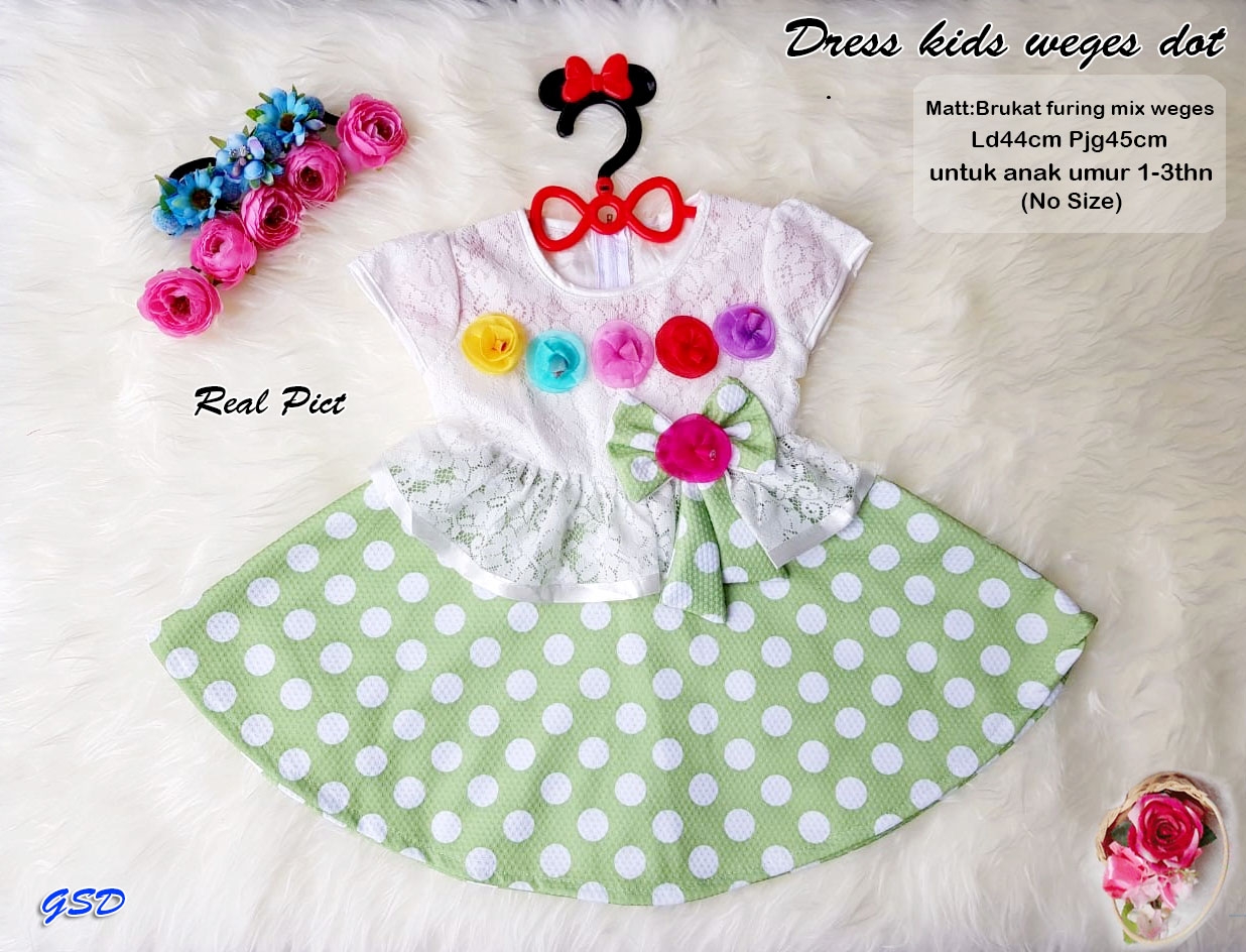 Dress kids weges dot hijau@65rb min 3pcs ecer 70rb dress brukat furing kombi weges polkadot belakang sleting tali ikat tempel belakang Ld44cm Pjg45cm Fit 1-3thn (no size) (150gr)
