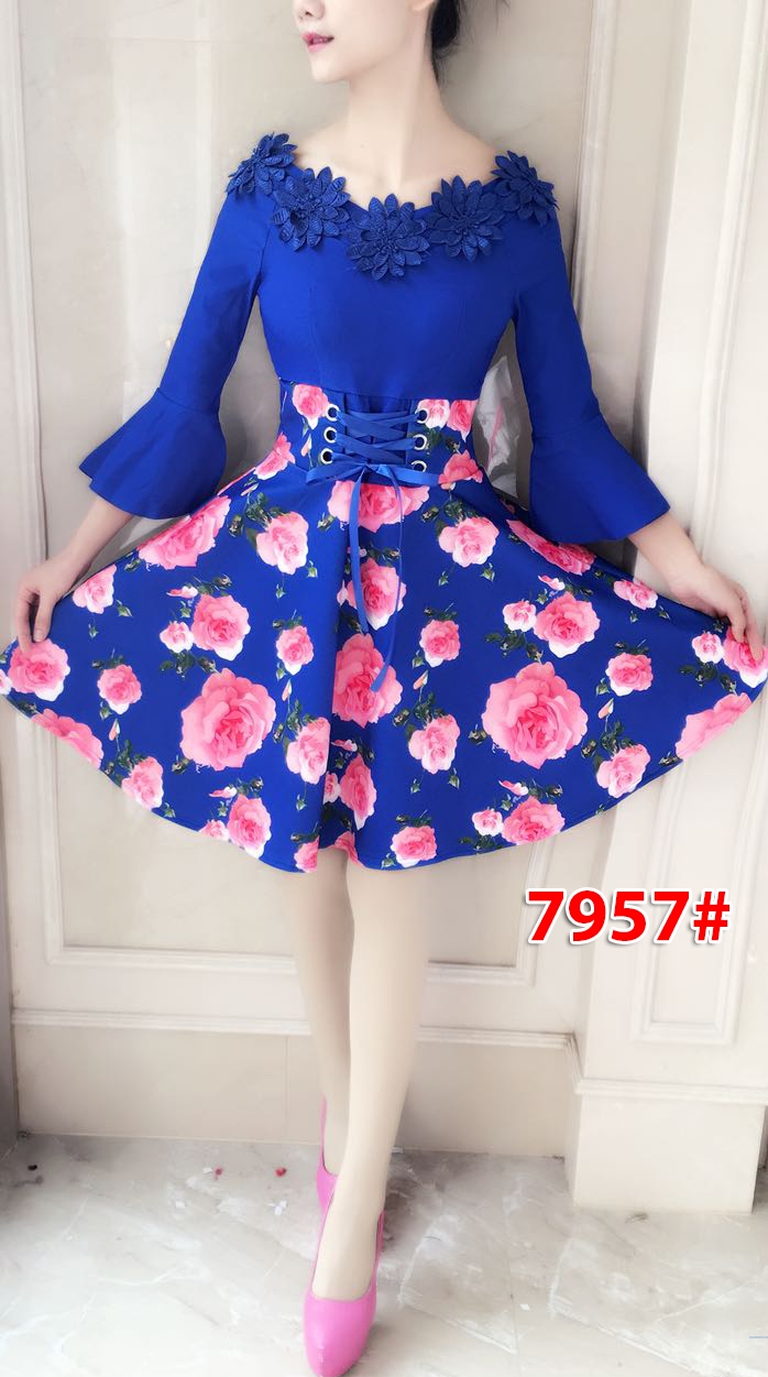 Dress import 7957 blue@135rb min 3pcs ecer 140rb bahan katun streth kombi scuba dress lengan panjang terompet LD80cm Pjg70cm +belt lepas (400gr)
