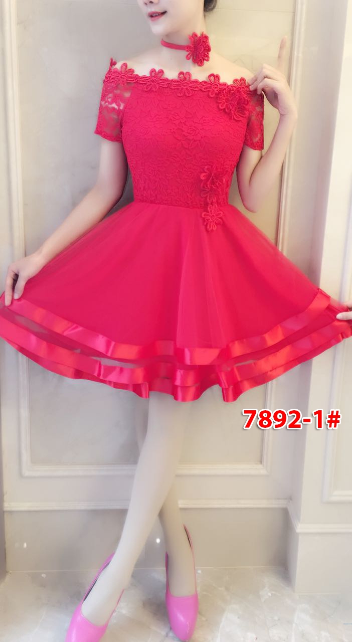 Dress 7892-1 red@135rb min 3pcs ecer 140rb terusan dress brukat streth kombi tile Ld80cm Pjg75cm+ Acc leher (400gr)