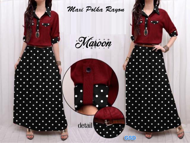 Maxi polka rayon maroon@65rb min 3pcs ecer 70rb bahan katun rayon maxi lengan panjang kancing hidup kancing hidup pinggang karet Ld90cm Pjg125cm Fit M (300gr)ada belt