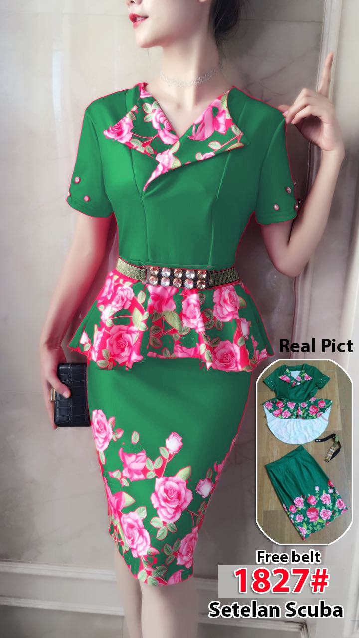 Setelan 1827 bunga hijau@125rb min 3pcs ecer 130rb bahan scuba,blus Ld80cm Pjg43cm +Rok span Pjg45cm +belt Fit M (400gr)