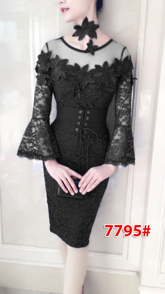 Dress 7795 black@125rb min 3pcs ecer 130rb terusan dress brukat streth Furing Ld80cm Pjg85cm +Acc leher Fit M (300gr)