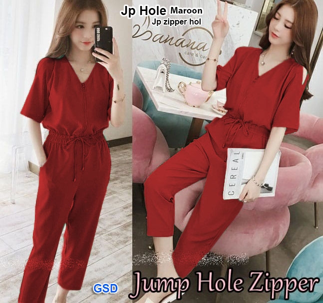 Jp hole maroon@62rb min 3pcs ecer 67rb bahan Moscrepe terusan celana jumper depan sleting pinggang karet ada saku kiri kanan Ld90cm Pjg125cm Fit M (320gr)