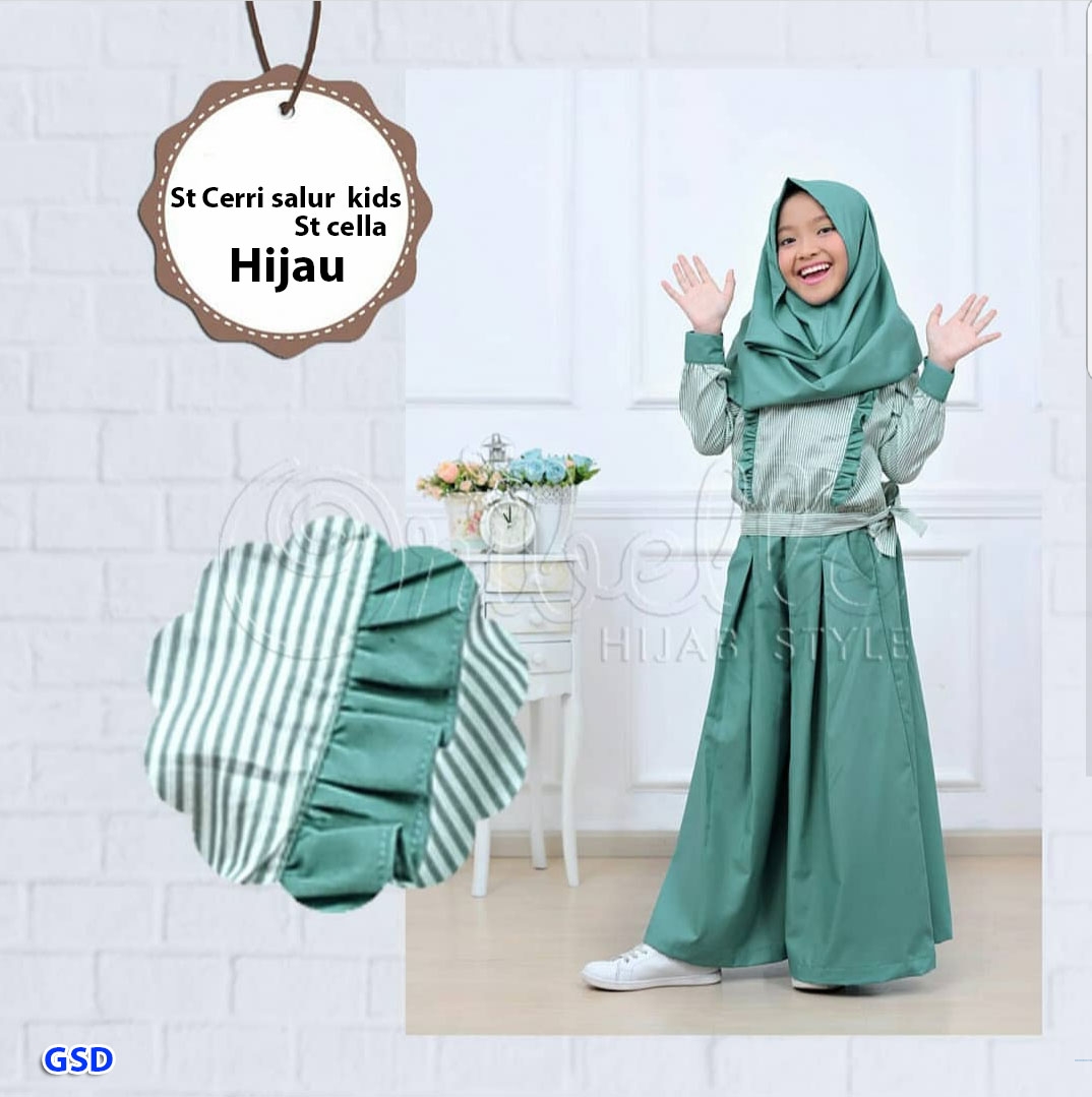 St cerri salur hijau@95rb min 3pcs ecer 100rb blus lengan panjang bahan katun belakang atas kancing 1 Ld80cm Pjg50cm +celana kulot baletoli Pjg70cm ada saku kiri kanan pinggang belakang karet +Pashmina Fit anak 7-10thn (No size) 500gr