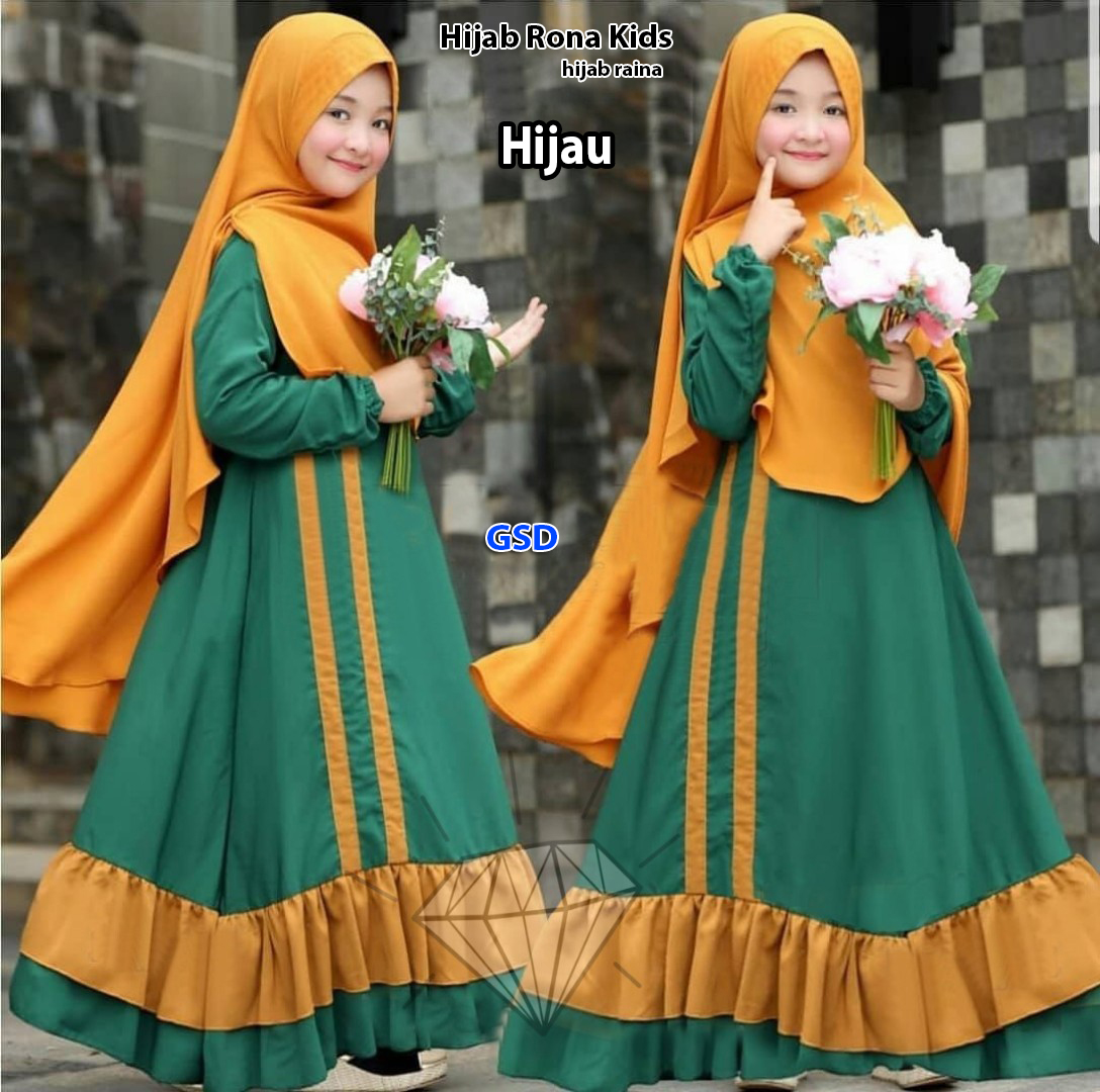 Hijab rona hijau@87rb min 3pcs ecer 92rb bahan baletoli maxi lengan panjang belakang seleting pinggang tali ikat Ld84cm Pjg90cm +bergo jadi Pjg85cm Fit 5-7thn (tergantung tinggi anak) (320gr)