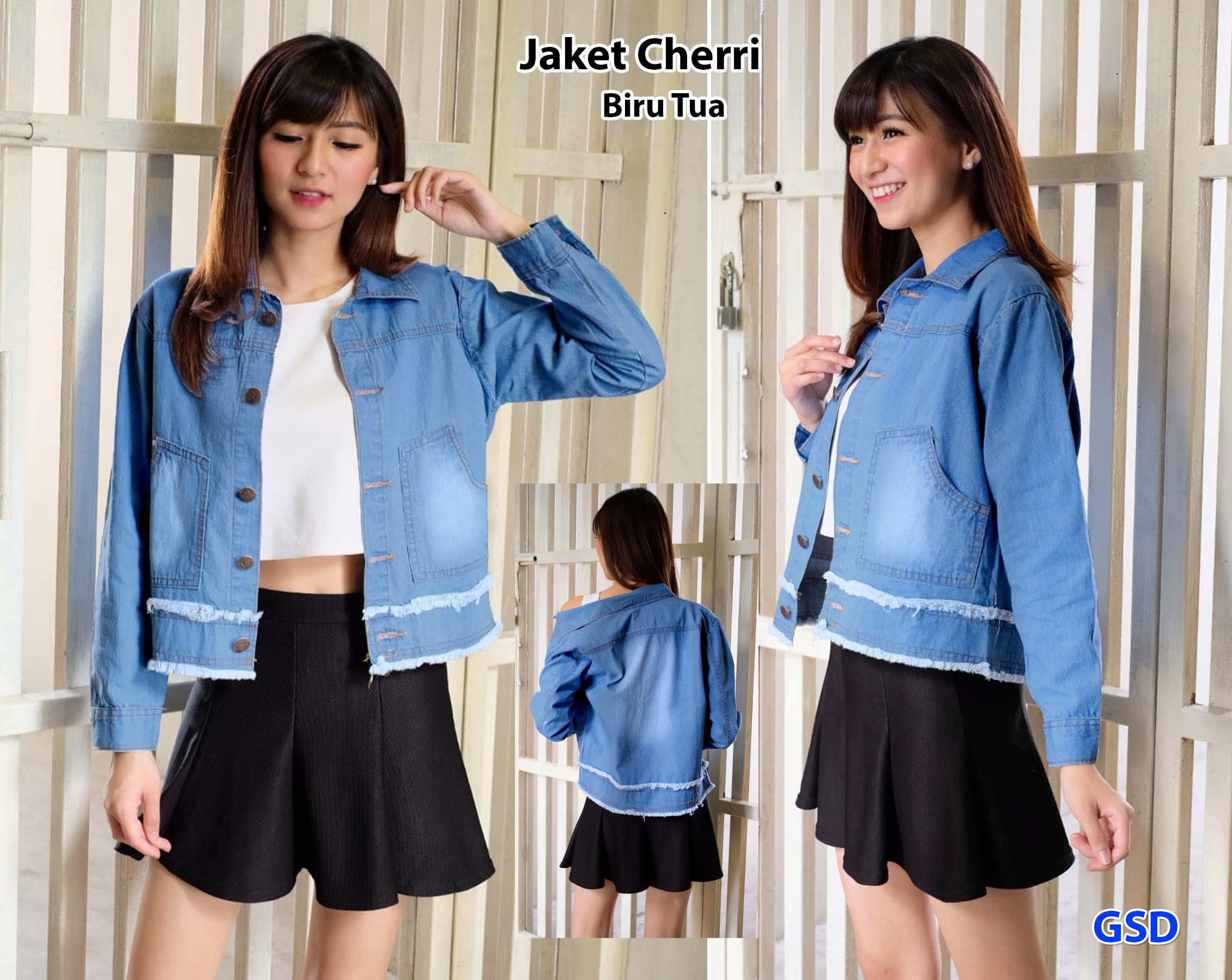 Jaket cherri jeans biru tua@76rb min 3pcs ecer 81rb bahan jeans lengan panjang Kancing hidup Ld86cm Pjg50cm Fit M (550gr)