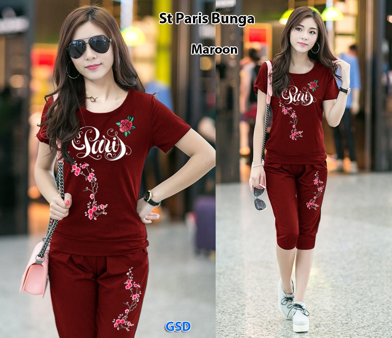 St paris bunga maroon@62rb min 3pcs ecer 67rb bahan babyterry blus sablon Ld84cm Pjg60cm +celana ada saku kiri kanan Pjg68cm Fit M (500gr)