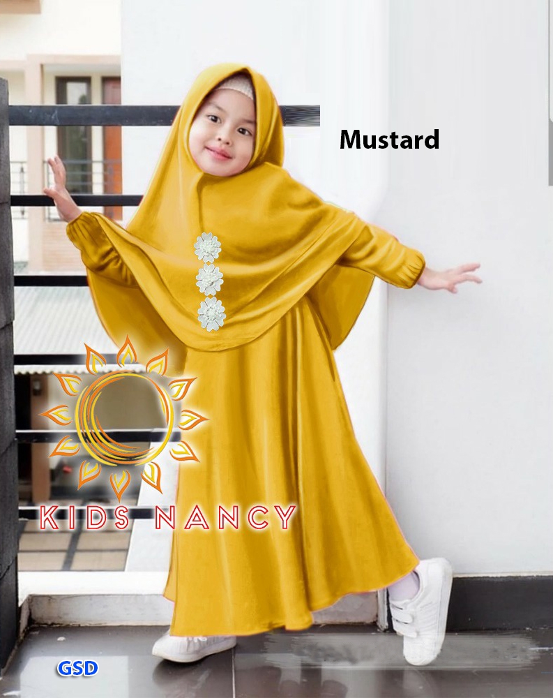 Maxi nancy kids mustard@88rb min 3pcs ecer 93rb bahan baletoli,maxi lengan panjang Ld66cm Pjg75cm +bergo jadi tempel renda bunga putih Pjg50cm Fit anak 3-5thn (No Size tergantung anak) 320gr