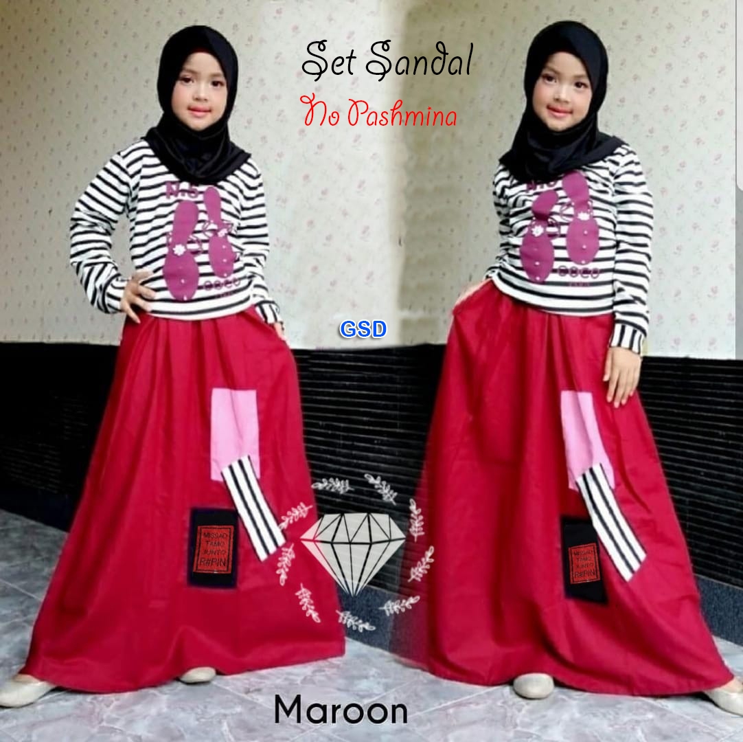 Set sandal kids maroon@81rb min 3pcs ecer 86rb blus kaos salur sablon lengan panjang salur Ld80cm Pjg50cm+Rok katun pinggang karet Pjg75cm fit anak 5-7thn No size tergantung anak (320gr)