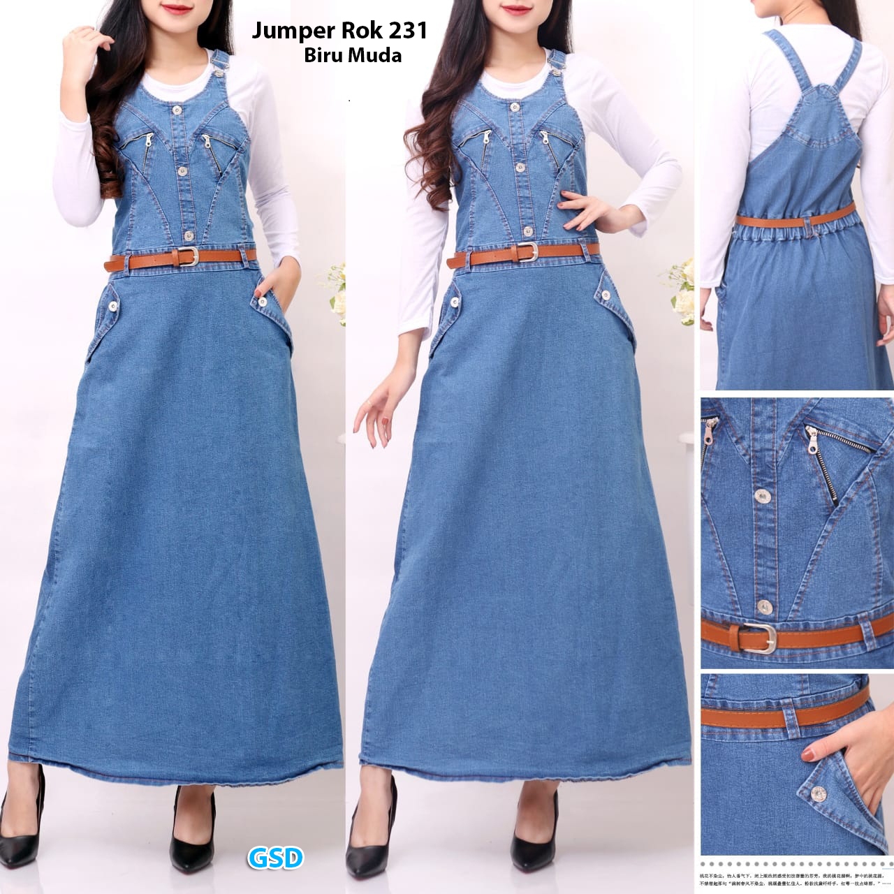 jumper rok 231 biru muda@100rb min 3pcs ecer 105rb blus kaos putih,lengan panjang Ld70cm Pjg48cm+dress jeans panjang pinggang belakang karet ada saku kiri kanan Pjg125cm Fit M+belt kecil coklat (850gr)