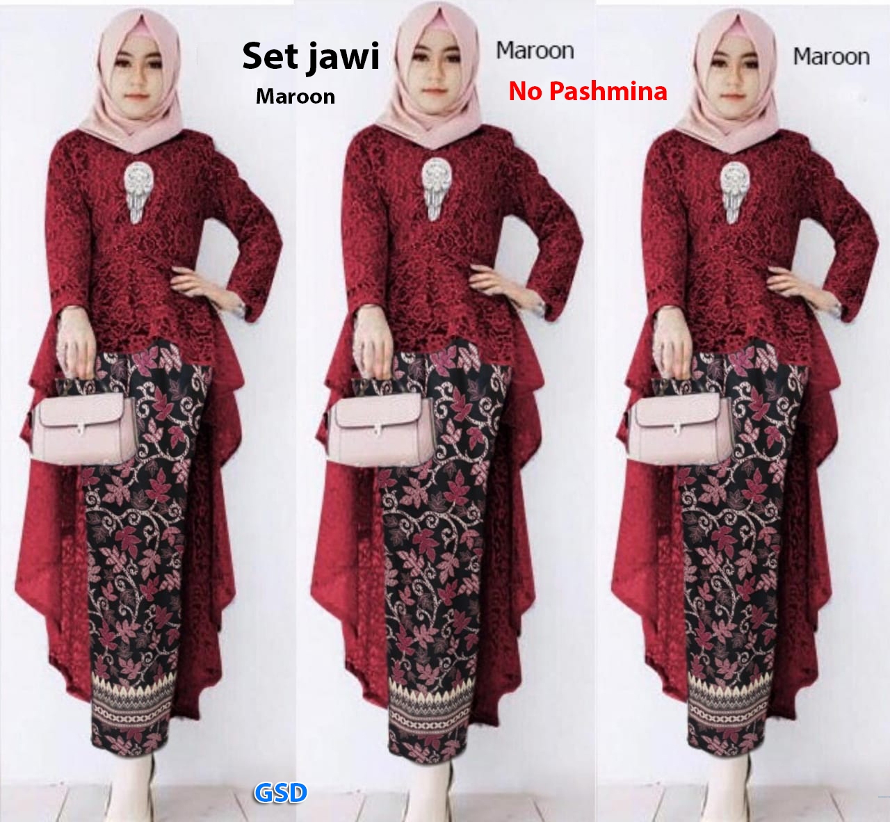 Set jawi maroon@97rb min 3pcs ecer 102rb bahan brukat kombinasi saten batik,blus lengan panjang Ld80cm Pjg60cm belakang 80cm +Rok span Pjg100cm Fit M (400gr)