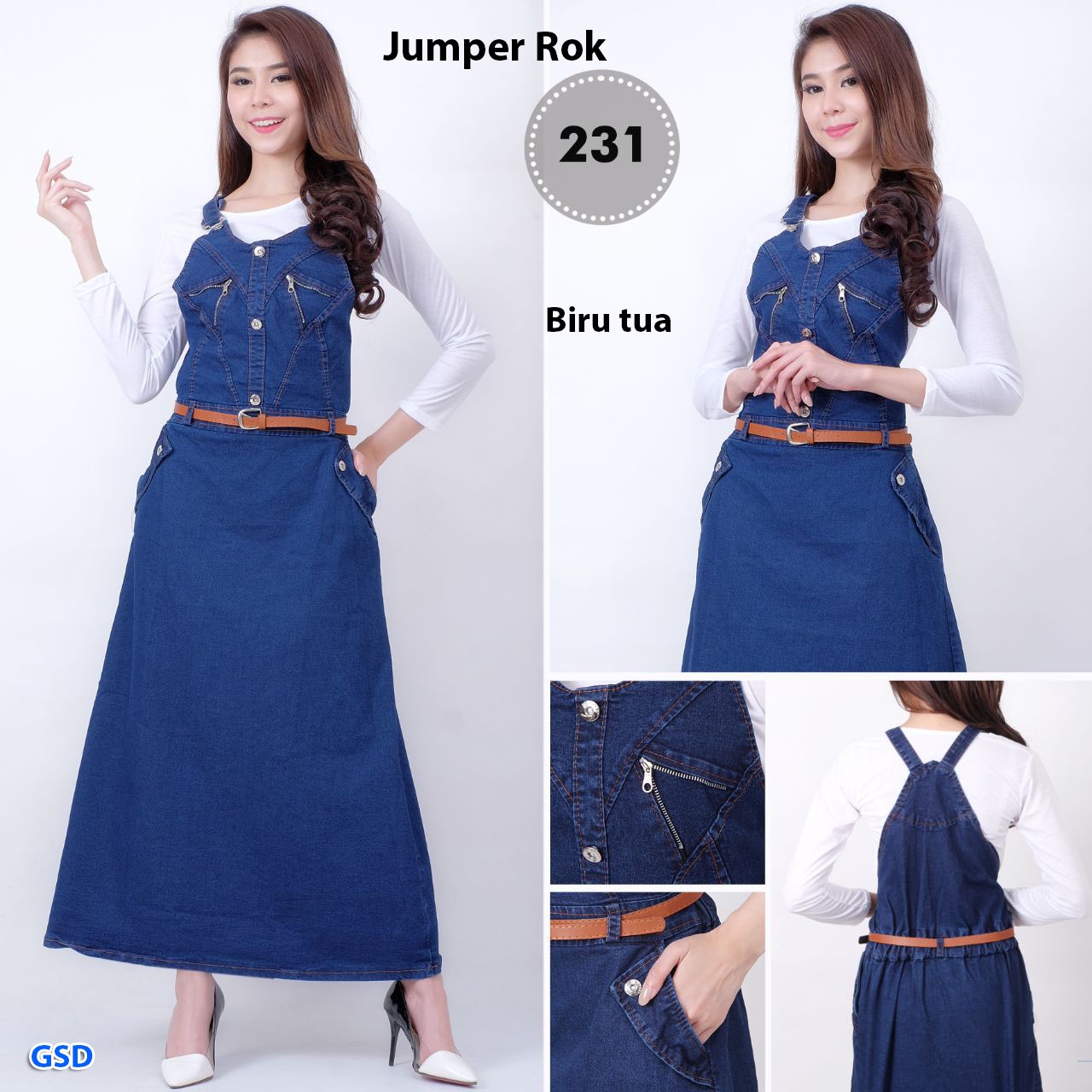 jumper rok 231 biru tua@100rb min 3pcs ecer 105rb blus kaos putih,lengan panjang Ld70cm Pjg48cm+dress jeans panjang pinggang belakang karet ada saku kiri kanan Pjg125cm Fit M+belt kecil coklat (850gr)
