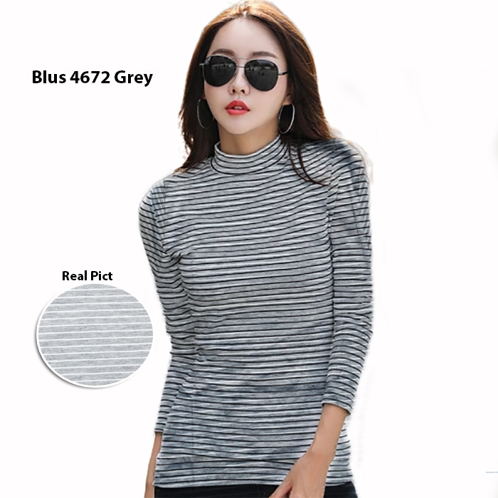 Blus salur 4672 grey@16rb ecer 21rb bahan spandek salur lengan panjang leher tinggi Ld76cm Pjg55cm Fit M (200gr)