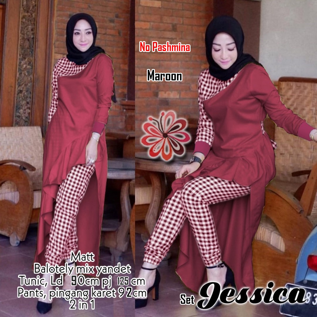 Set jessica maroon@112rb min 3pcs ecer 117rb bahan baletoli kombi katun kotak maxi lengan panjang belakang atas kancing 1 pinggang tali ikat Ld90cm Pjg125cm +celana kotak Pjg92cm Fit M (430gr)