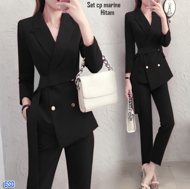 set cp marina htm@68rb min 3pcs ecer 73rb bahan wafle ngak streth,blazer tangan panjang kancing gold hidup Ld90cm Pjg62cm +celana ada saku kiri kanan Pjg85cm +belt bahan lepas Fit M (500gr)