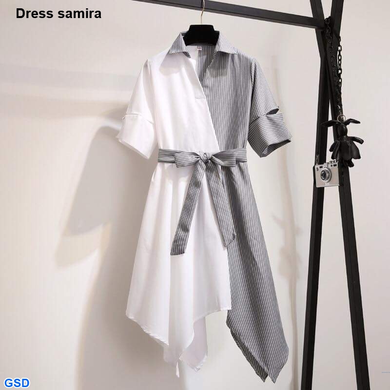 Dress samira@61rb min 3pcs ecer 66rb bahan katun salur abu kombi twiscone putih Ld96cm Pjg90cm+ belt bahan salur tempel (220gr)