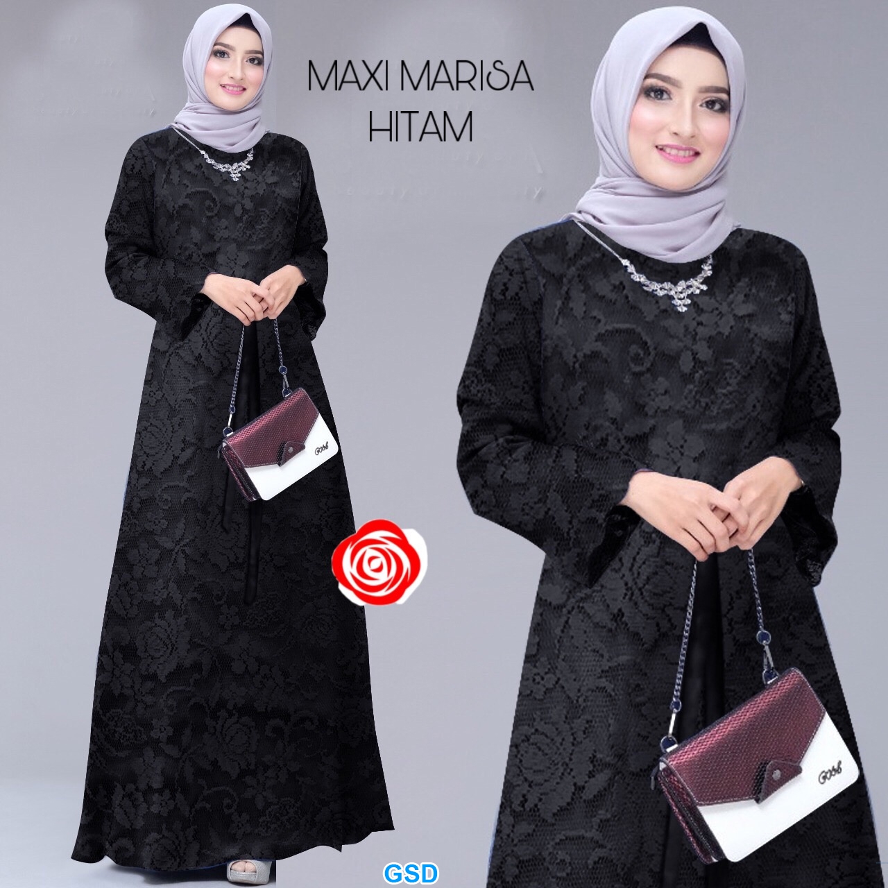 Maxi marisa hitam@89rb min 3pcs ecer 94rb bahan brukat furing lengan panjang terompet ada tali ikat Ld80cm Pjg110cm Fit M (400gr) No Pashmina