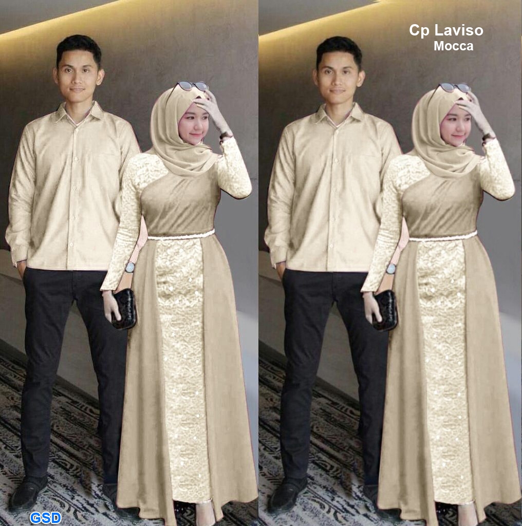 Cp laviso mocca@145rb min 3psg ecer 150rb Cowok:bahan woll peach kemeja lengan panjang,kancing hidup Ld100cm Pjg67cm +Cewe: bahan wollpeach kombi brukat,aplikasi mutiara tembak tabur Ld80cm Pjg125cm sleting jepang belakang Fit M semua (800gr) Tanpa Pashmina