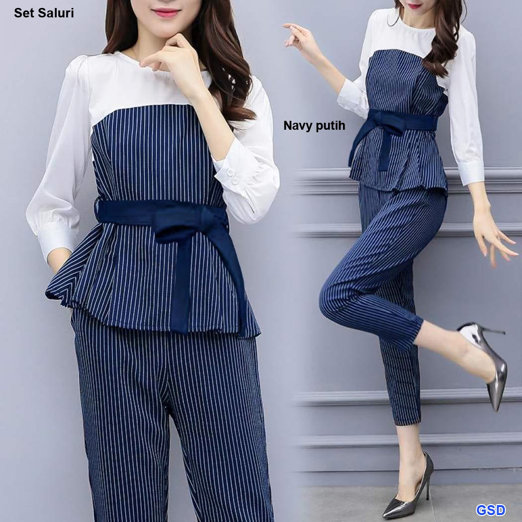 set saluri navy pth@88rb min 3pcs ecer 93rb bahan baletoli kombi katun salur,blus tangan 7/9 pinggang tali ikat tempel Ld96cm Pjg65cm +celana pinggang belakang karet saku kiri kanan Pjg95cm Fit M (400gr)