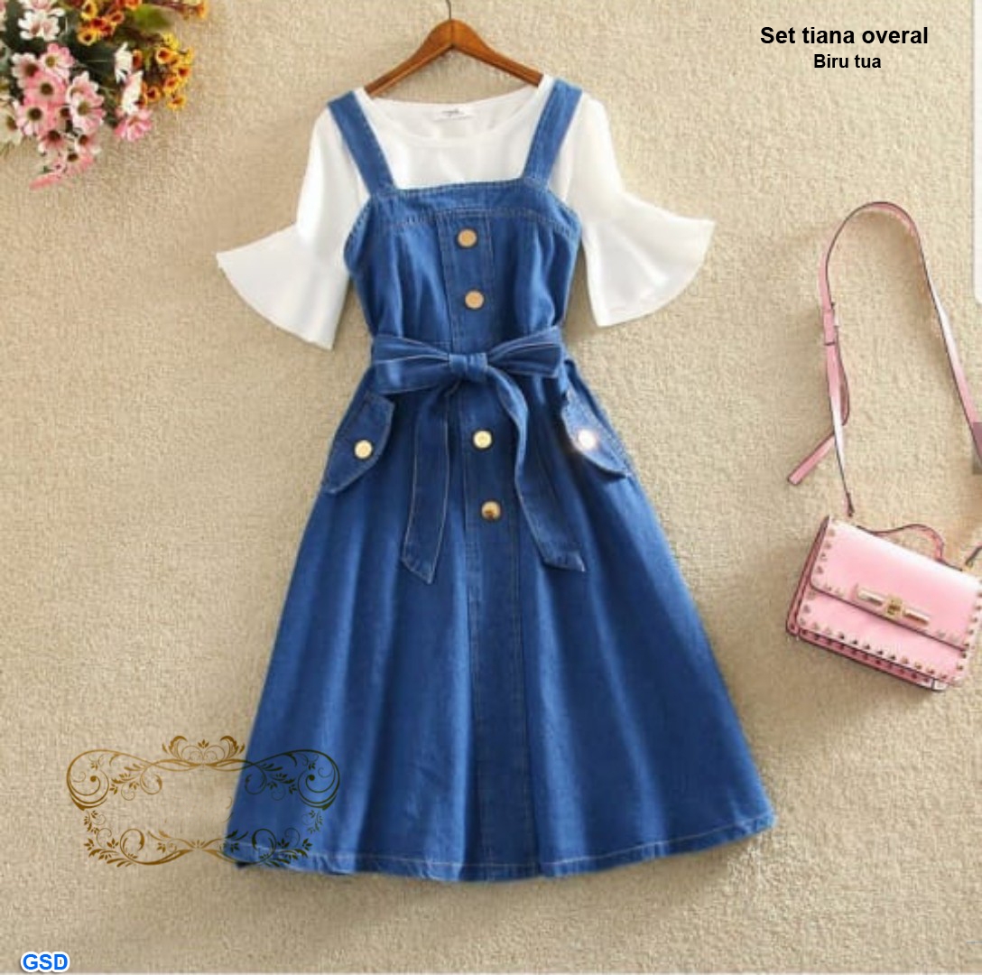 Set tiana overal biru tua@69rb min 3pcs ecer 74rb Blus kaos putih Ld90cm Pjg55cm +outer katun pinggang belakang karet Pjg90cm tali ikat tempel Fit M (300gr)