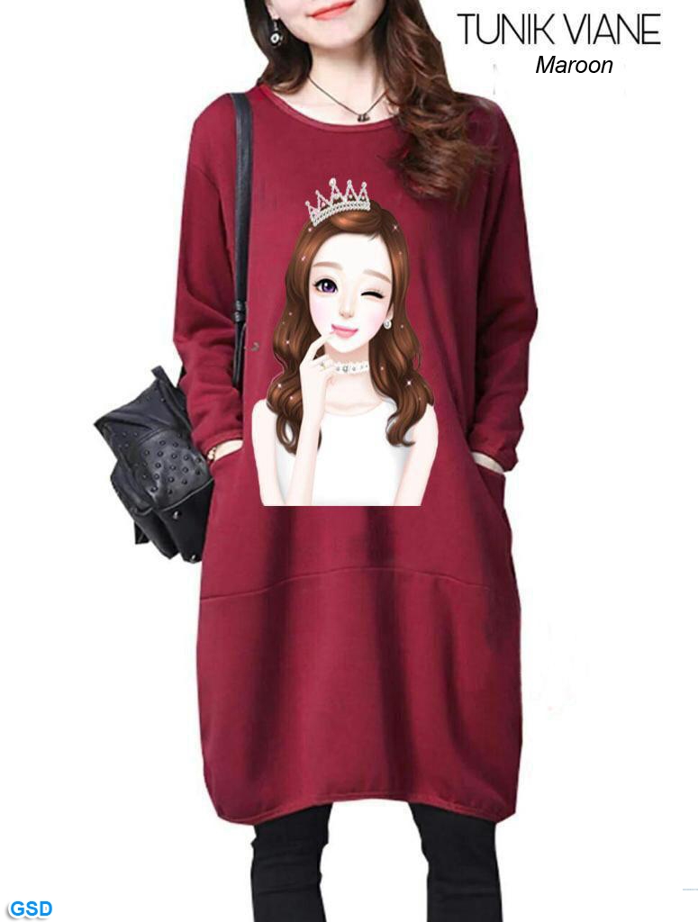 Tunik viane maroon@58rb min 3pcs ecer 63rb bahan babyterry lengan panjang sablon ada saku kiri kanan Ld100cm Pjg90cm Fit L (300gr)