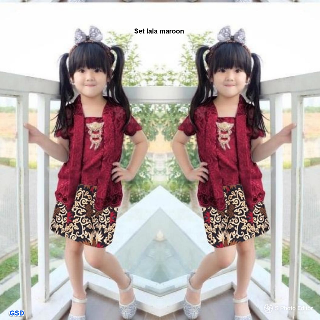 Set lala maroon@49rb min 3pcs ecer 54rb blus brukat furing Ld60cm Pjg40cm+ rok saten batik pinggang karet Pjg58cm Fit anak 3-5thn (Tidak ada ukuran tergantung anak) 200gr
