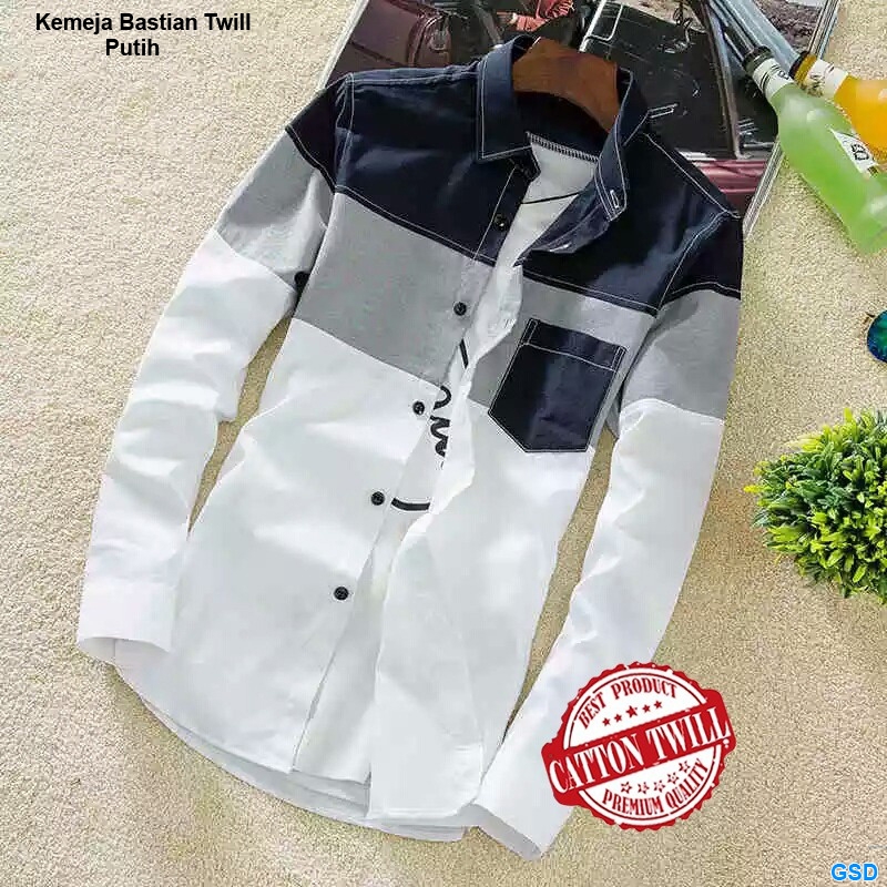 Kmja bastian twill putih@59rb min 3pcs ecer 64rb bahan full katun TWILL lengan panjang Ld106cm Pjg70cm Slim Fit L depan saku (300gr)