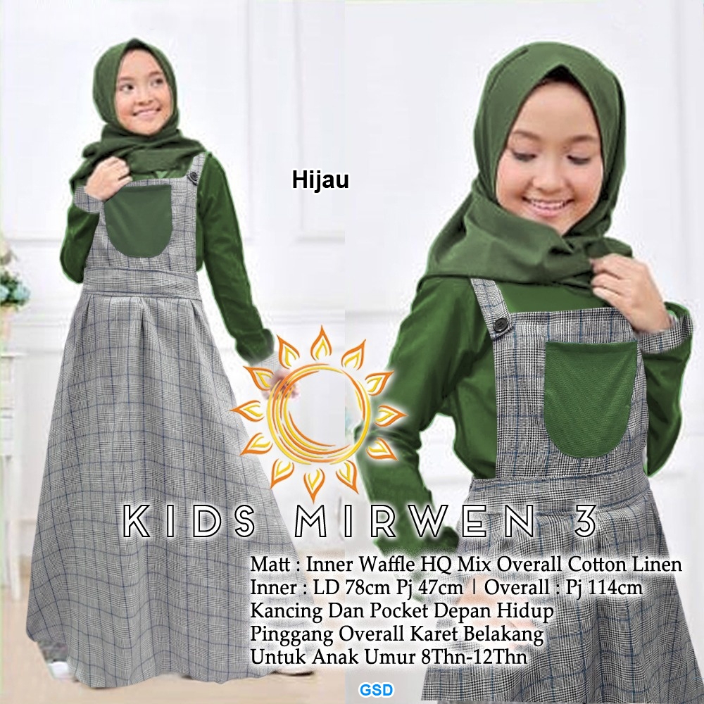 kids mirwen hijau@96rb min 3pcs ecer 101rb inner waffle HQ mix overall cotton linen, inner Ld78cm Pjg47cm ,Overall Pjg114cm,kancing dan pocket depan hidup,pinggang overall karet belakang Fit umur 8-12thn (tidak ada ukuran tergantung anak) Tanpa Pasmina (600gr)