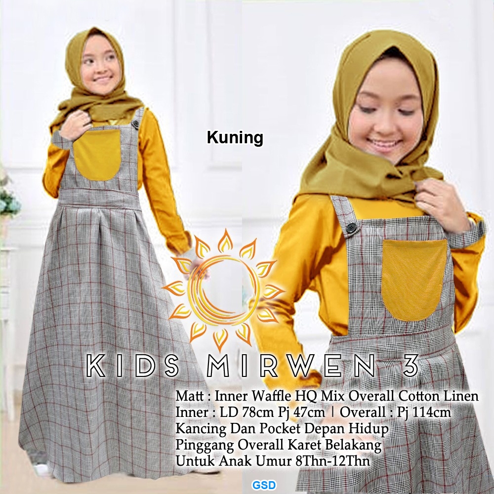 kids mirwen kuning@96rb min 3pcs ecer 101rb inner waffle HQ mix overall cotton linen, inner Ld78cm Pjg47cm ,Overall Pjg114cm,kancing dan pocket depan hidup,pinggang overall karet belakang Fit umur 8-12thn (tidak ada ukuran tergantung anak) Tanpa Pasmina (600gr)