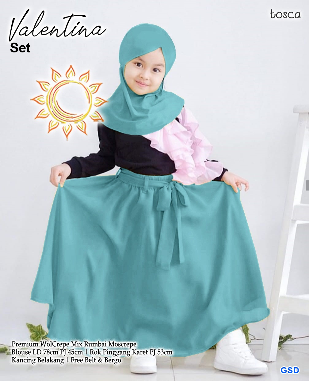 Set valetina tosca@79rb min 3pcs ecer 84rb premium woolcrepe mix rumbai moscrepe Blouse Ld78cm Pjg45cm+ Rok pinggang karet Pjg53cm kancing belakang free belt+bergo Fit 5-6thn (tidak ada ukuran tergantung anak) 500gr