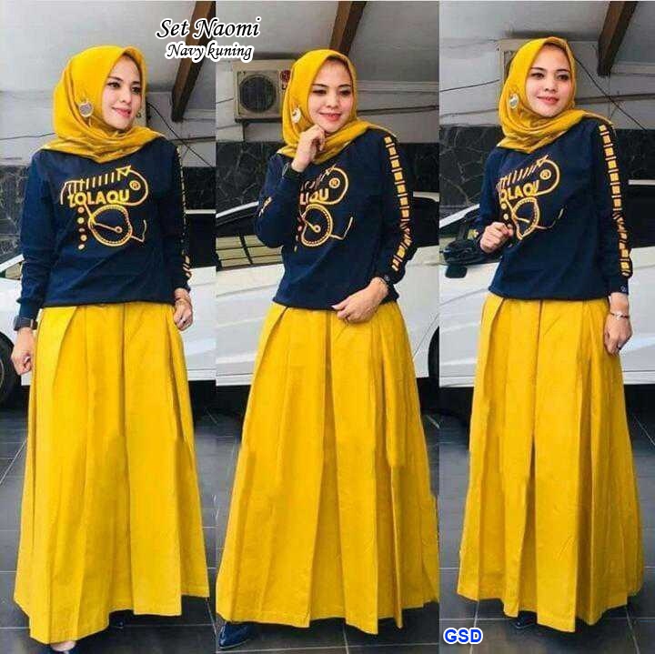 Set naomi kuning@103rb min 3pcs ecer 108rb bahan babyterry Blus Ld94cm Pjg58cm + Rok pinggang karet Pjg90cm Fit L (700gr) Tanpa pasmina