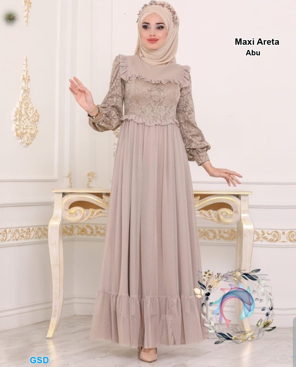 Maxi areta abu@110rb min 3pcs ecer 115rb bahan brukat kombi tile rubiah dot lapis furing Ld80cm Pjg125cm sleting belakang pinggang karet Fit M Tanpa Pashmina (350gr)