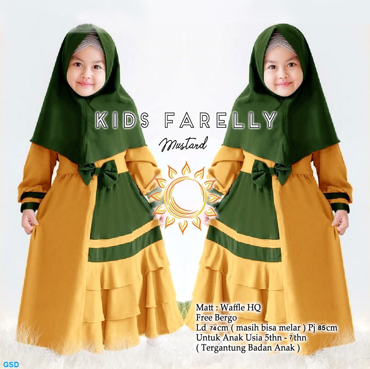 kids farelly mustard@89rb min 3pcs ecer 94rb bahan waffle maxi lengan panjang Ld74cm Pjg85cm + Pasmina Pjg42cm Fit anak 5-7thn (No Size,tergantung anak) 420gr