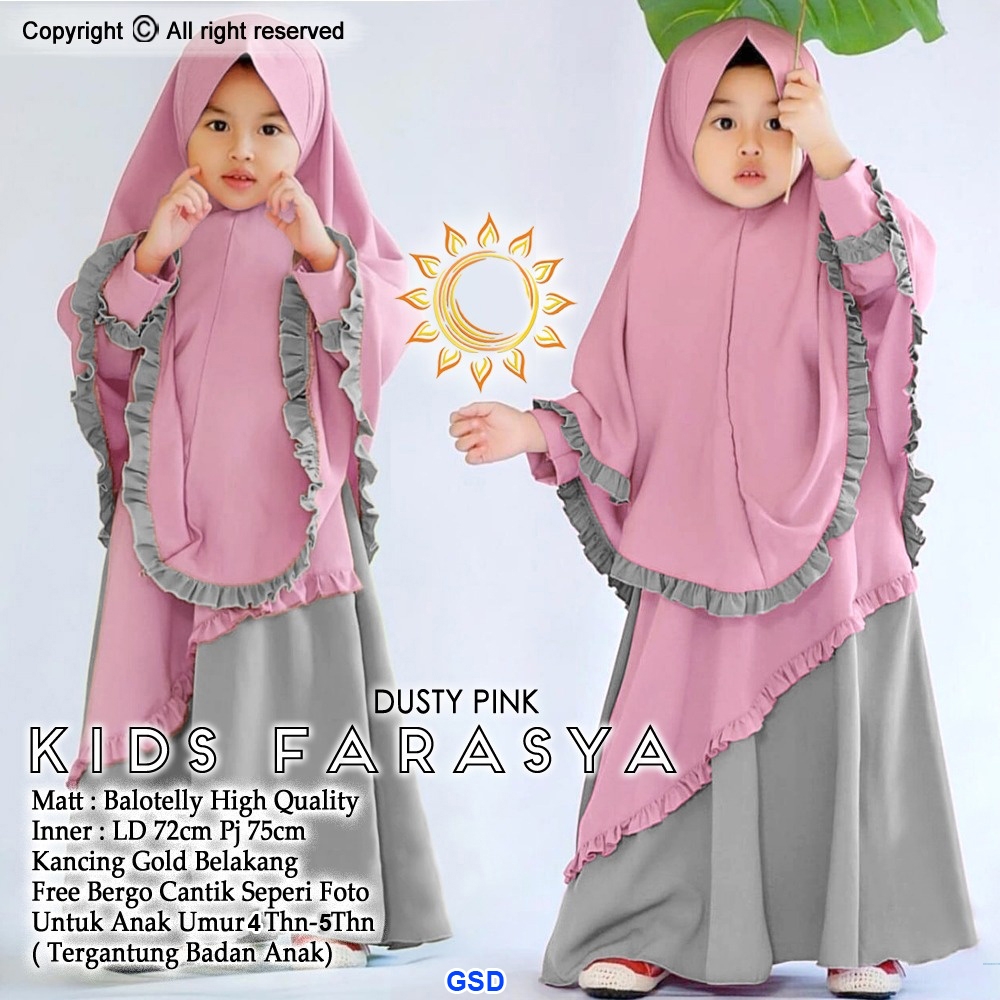 kids farasya dusty@76rb min 3pcs ecer 81rb bahan balotelly high quality.inner Ld72cm Pjg75cm kancing gold belakang,free pasmina cantik seperti foto ,Utk anak umur 4-5thn (tergantung badan anak) 500gr