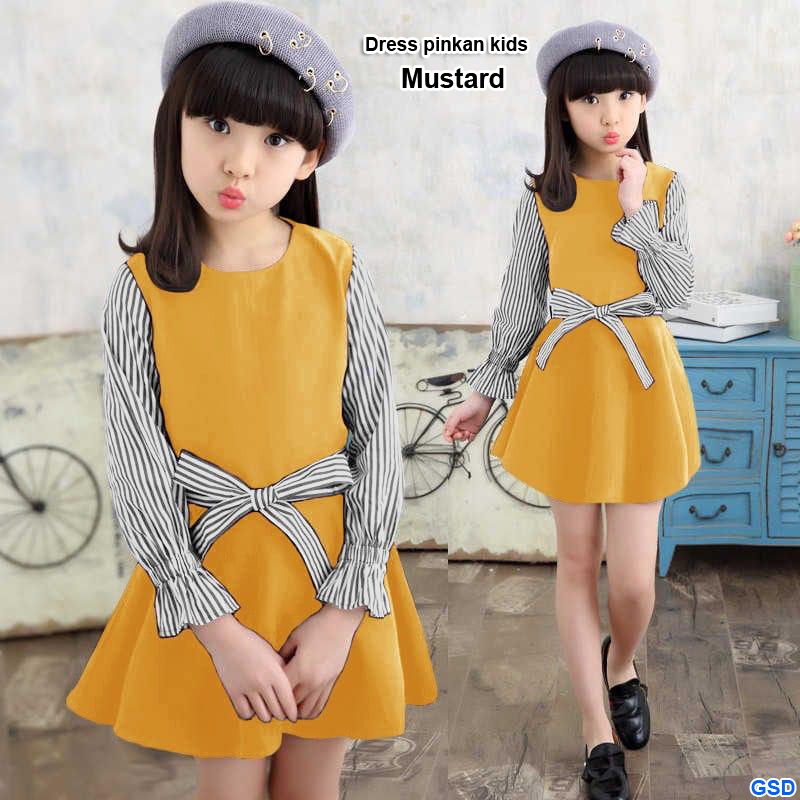 Dress pinkan mustard@52rb min 3pcs ecer 57rb bahan katun salur kombi baletoli Ld80cm Pjg65cm lengan panjang ada belt bahan salur lepas fit 5-7thn (No size tergantung anak) 220gr