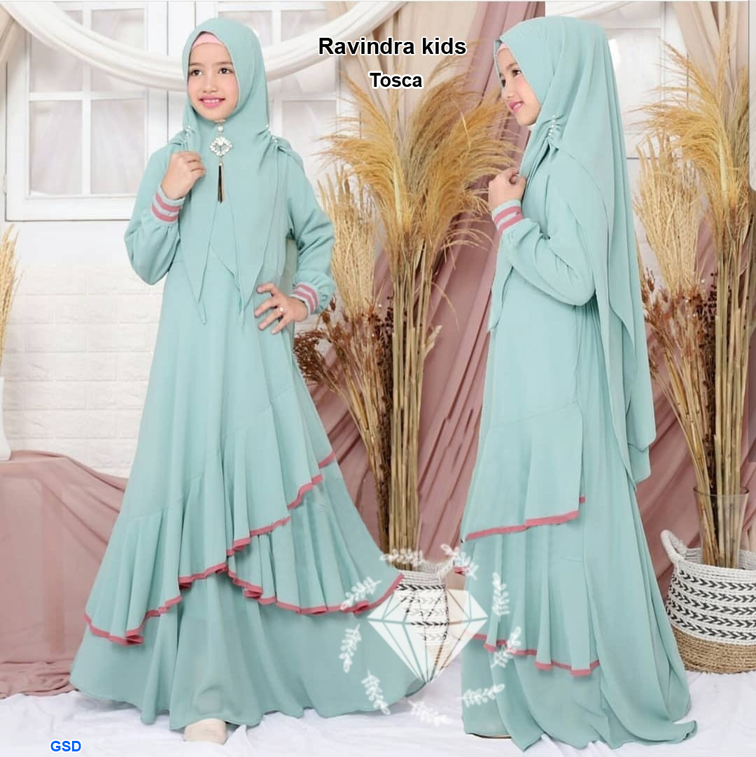 ravindra tosca@99rb min 3pcs ecer 104rb bahan moscrepe full aplikasi lis pita Ld84cm Pjg106cm sleting dan karet pinggang belakang free bergo cantik Fit anak 7-9thn (No size ,tergantung anak) 500gr