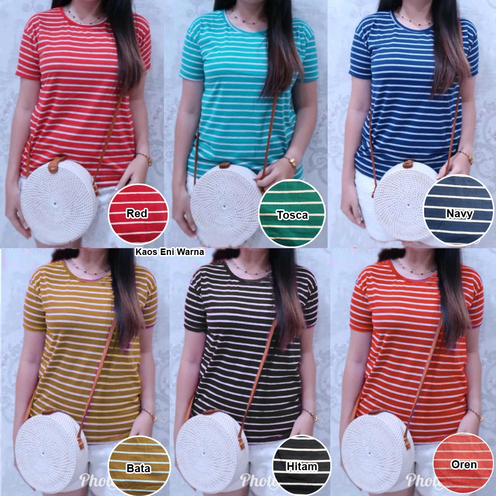 Kaos salur eni warna@20rb seri 6pcs (6warna)ecer 25rb bahan kaos salur Ld80cm Pjg60cm Fit M (200gr)