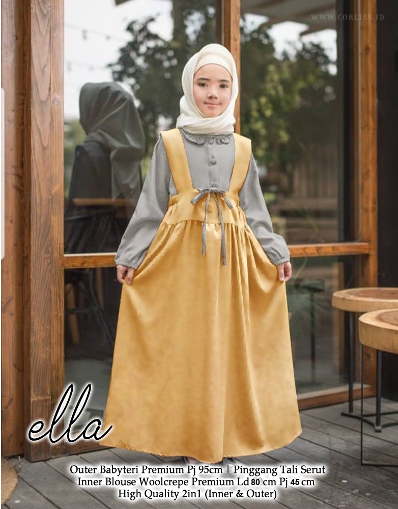 Gamis ella kids kuning@85rb min 3pcs ecer 90rb Bahan outer babyteri panjang 95cm pinggang tali di serut inner woolcrepe Lebar dada 80cm panjang 45cm Fit 5-8thn (Tidak ada ukuran tergantung anak) 450gr