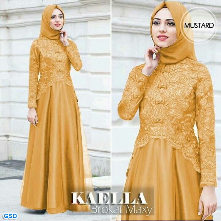 Maxi kaella mustard@108rb min 3pcs ecer 113rb maxi lengan panjang bahan brukat cornelli kombi tile wolfis premium pita depan 3 aplikasi mutiara tabur dipita Ld90cm Pjg125cm sleting jepang belakang (720gr) No Pasmina